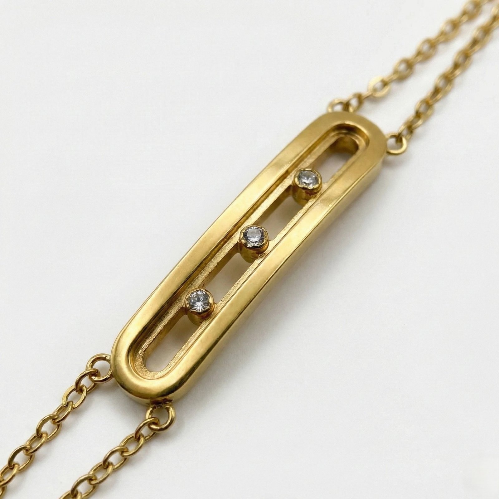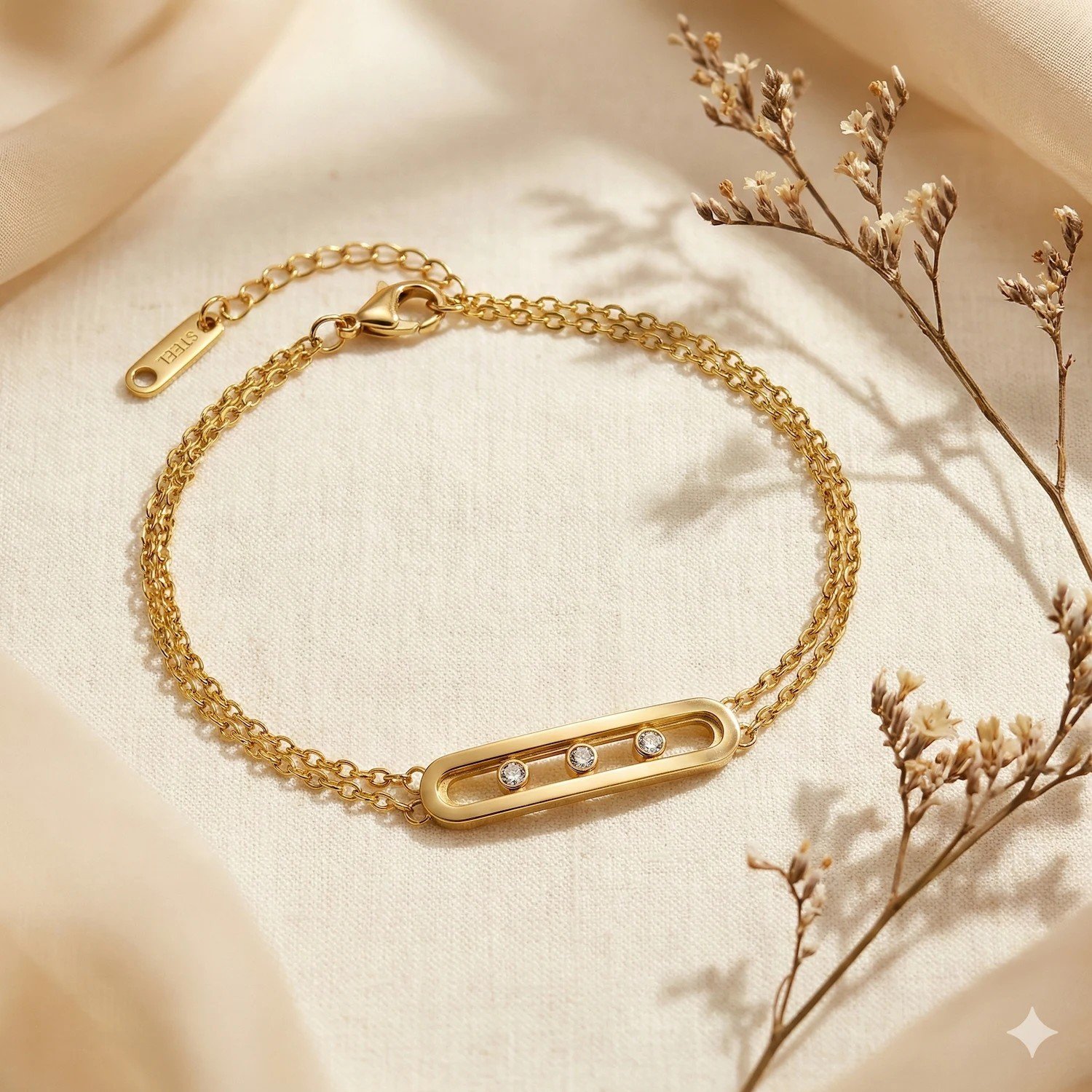 Crafted in a polished gold-tone finish, this bracelet features a refined double-chain design that adds dimension without heaviness. The elongated horizontal bar centerpiece is accented with three delicate round crystals, creating a balanced sparkle that feels modern and elegant.