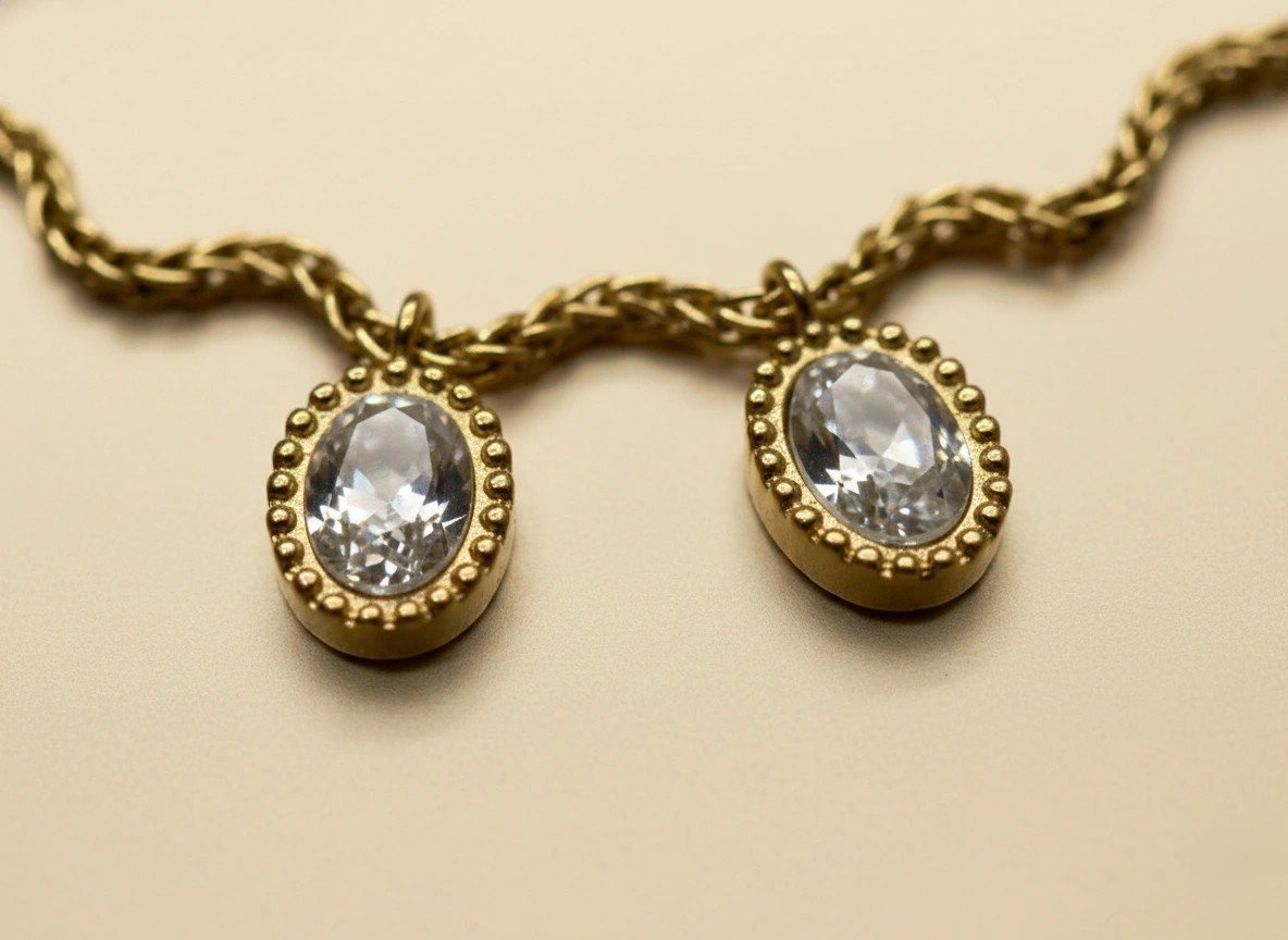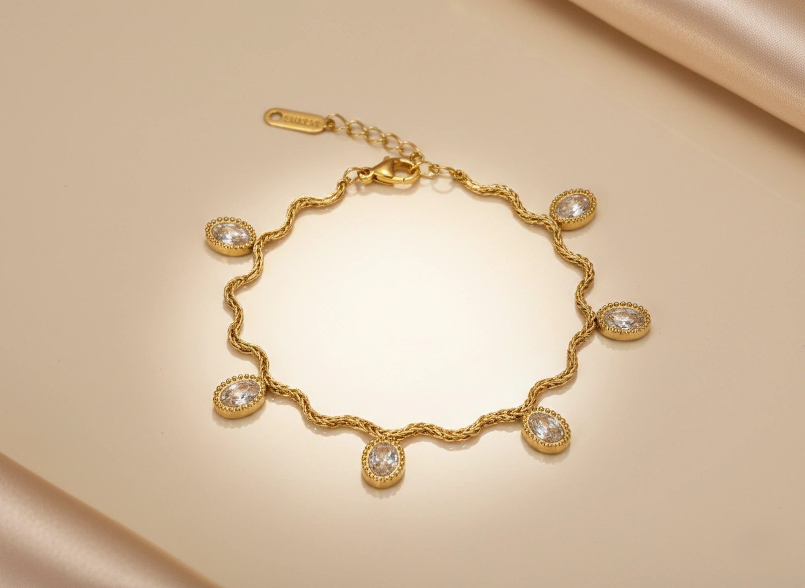 Crafted in a rich gold-tone finish, this bracelet features a beautifully twisted rope-style chain adorned with oval-cut crystal drop charms. Each crystal is encased in a delicate textured frame, enhancing its brilliance and adding a refined vintage touch.