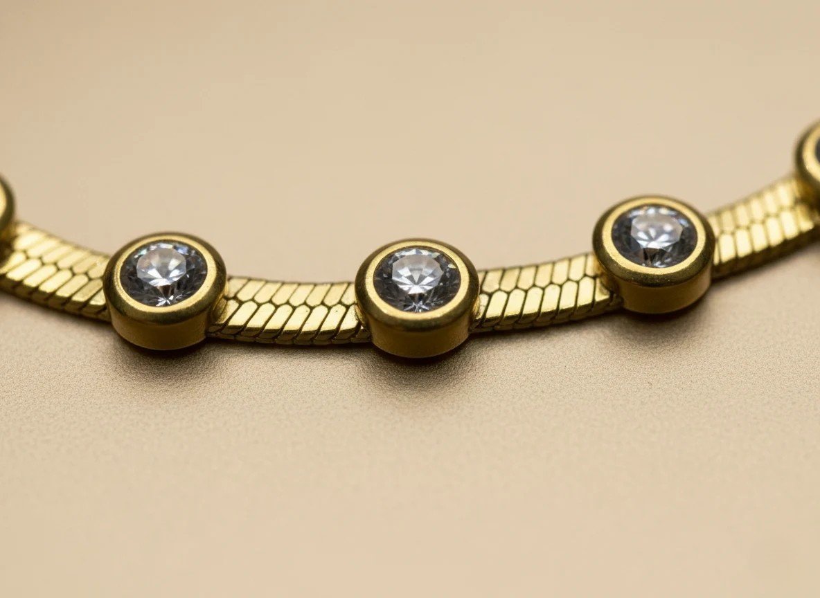 Elegant and radiant, this gold-tone snake chain bracelet features evenly spaced round bezel-set crystals for a sleek, modern look. Lightweight, skin-friendly and adjustable for a comfortable fit — perfect for daily and occasion wear.