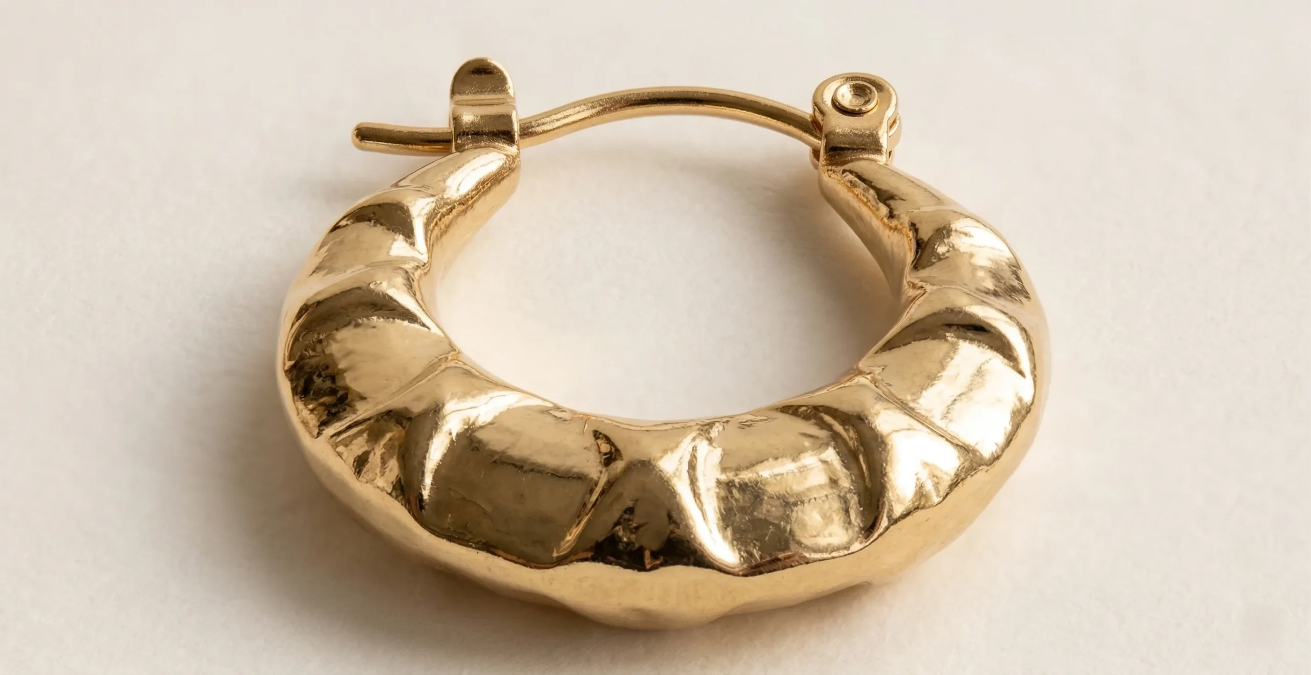 Crafted in a rich gold-tone finish, these earrings feature a thick hoop design with a textured hammered pattern that reflects light beautifully. The unique surface detailing gives the earrings a premium and trendy appearance while keeping the design minimal and versatile.