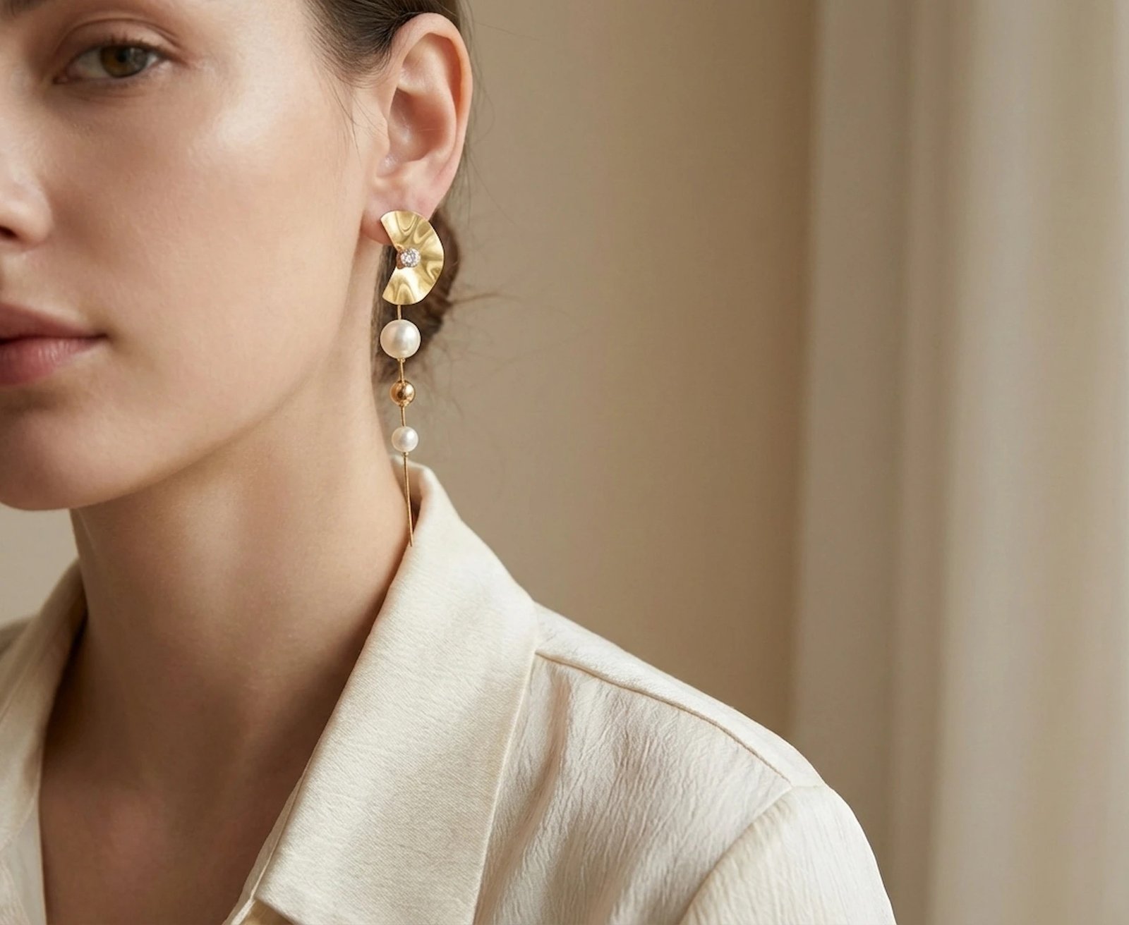 Below the structured top, luminous pearls cascade gracefully, paired with polished gold beads and a delicate elongated drop chain. The combination of geometric structure and soft pearl movement creates a striking contrast — bold yet feminine, structured yet fluid.