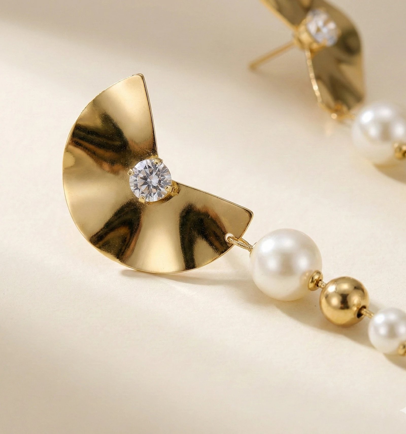 The Luna Pearl Cascade Statement Earrings are designed for moments that deserve attention. Featuring a sculpted half-moon gold stud with a brilliant crystal accent, this design radiates modern luxury with a timeless edge.