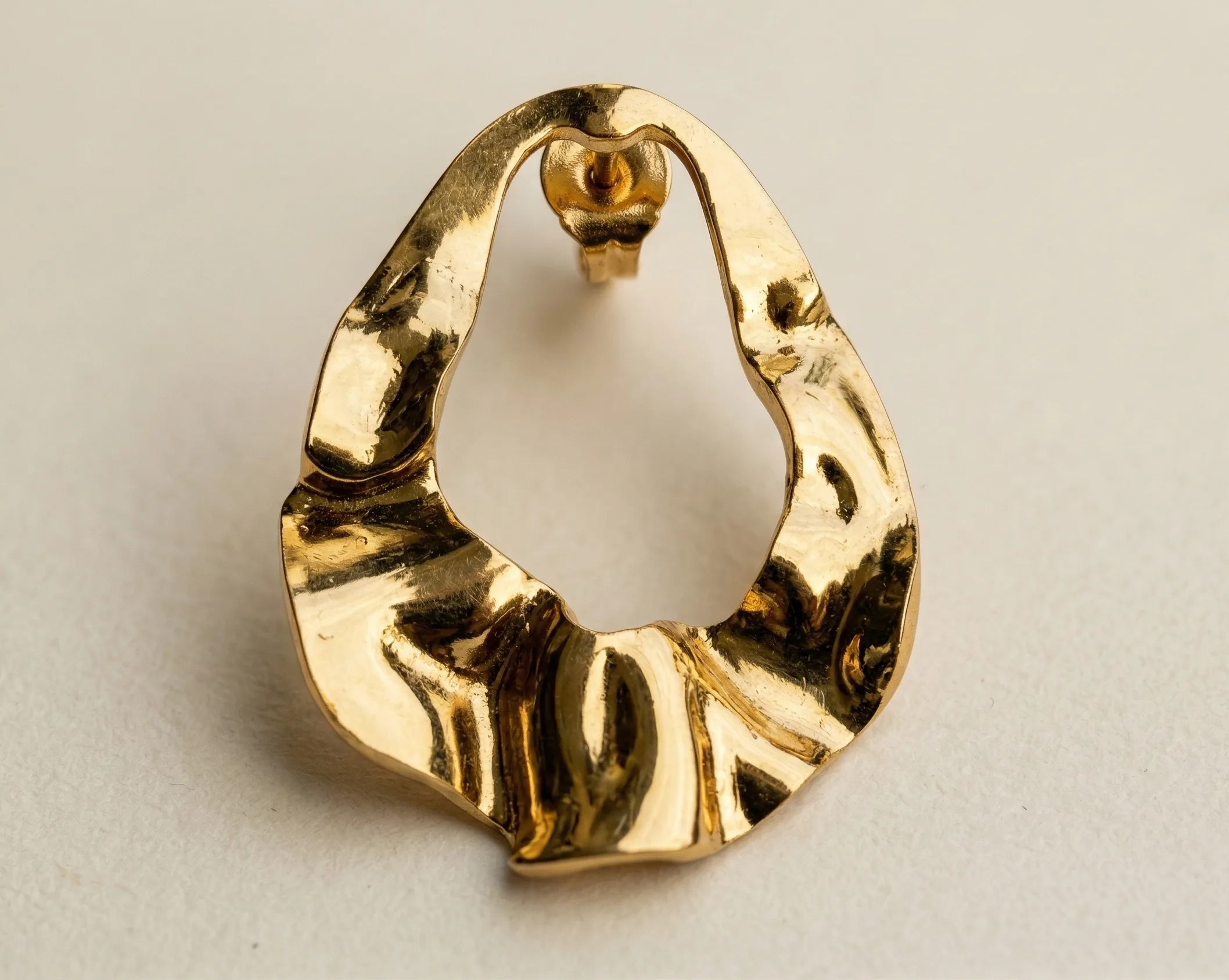 Crafted in a rich gold-tone finish, these earrings feature an abstract melted hoop shape with a fluid, uneven texture that gives them a unique and high-fashion look. The glossy polished surface reflects light beautifully, making the earrings look premium and stylish.