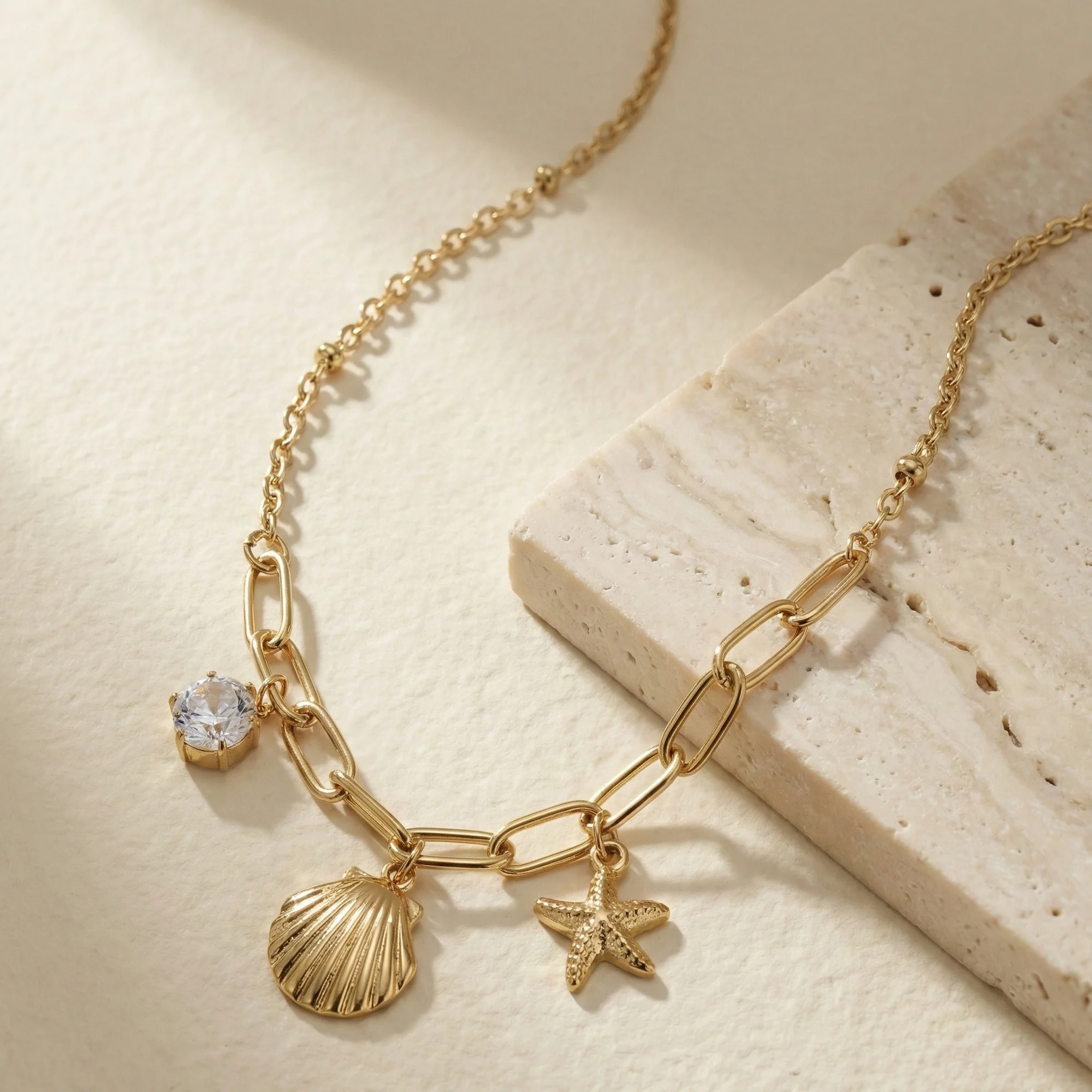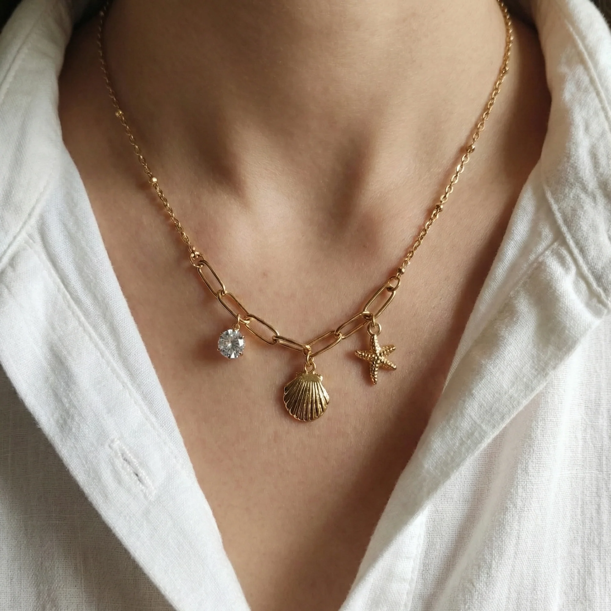 The 🌊Ocean Grace Gold-Plated Charm Necklace embodies understated luxury with ocean-inspired charms and a polished gold finish. Accented by a subtle crystal solitaire and designed with a modern link chain, it offers a perfect balance of minimal charm and refined detail.