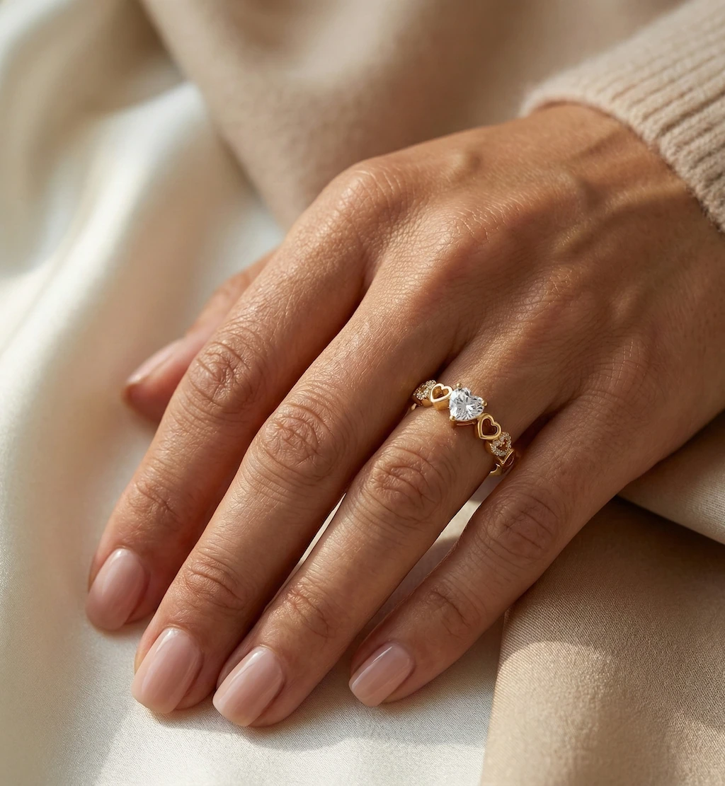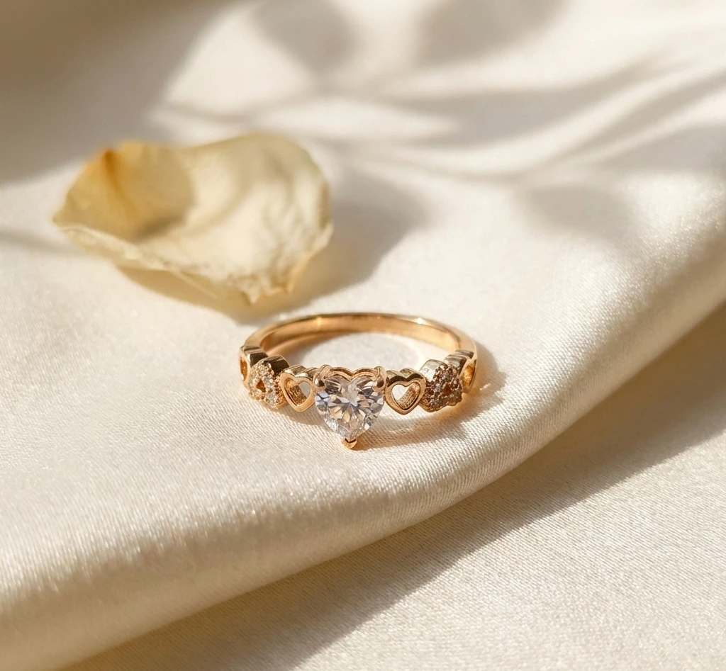A delicate gold-plated ring featuring a sparkling solitaire centerpiece framed by charming heart accents. Elegant, romantic, and perfect for everyday wear.