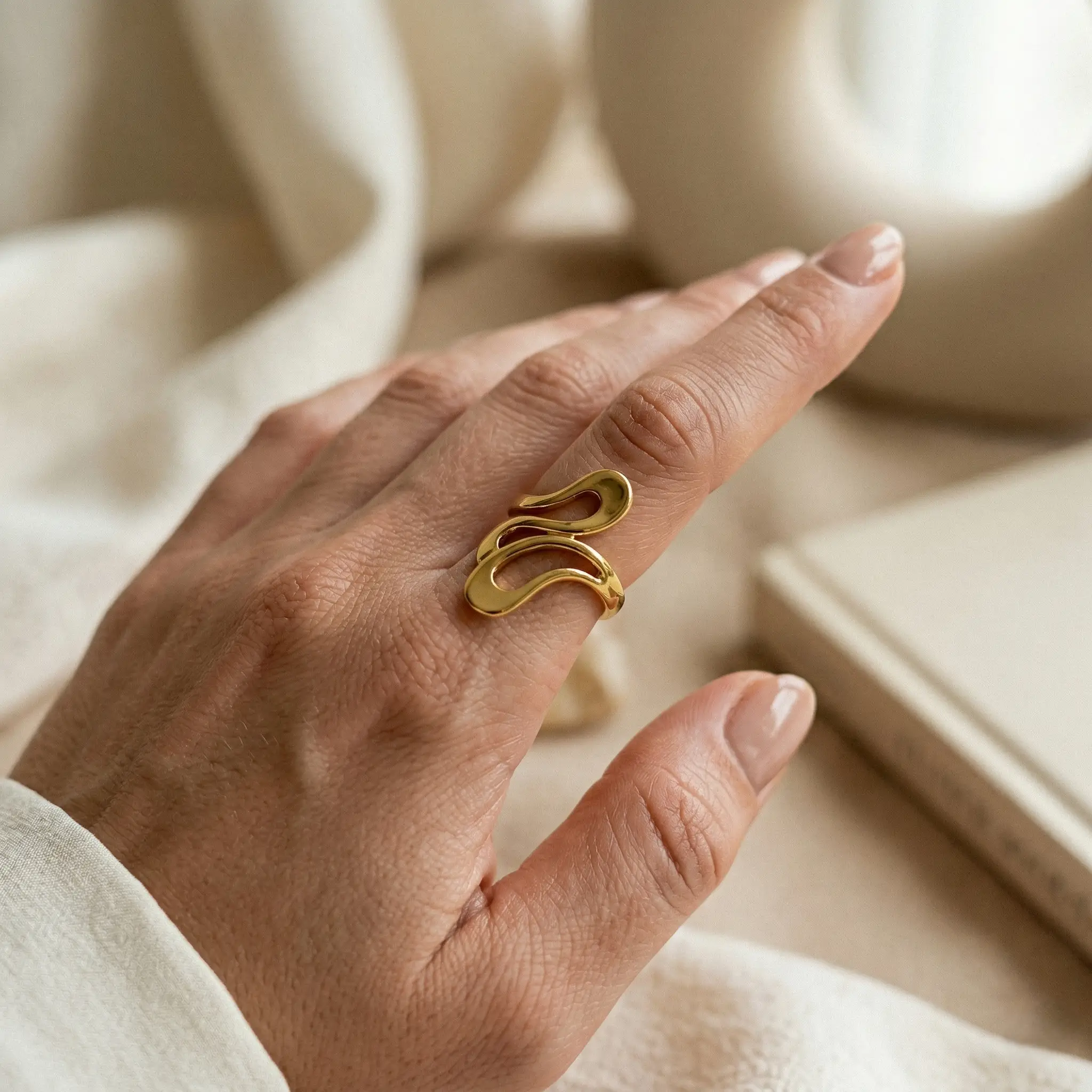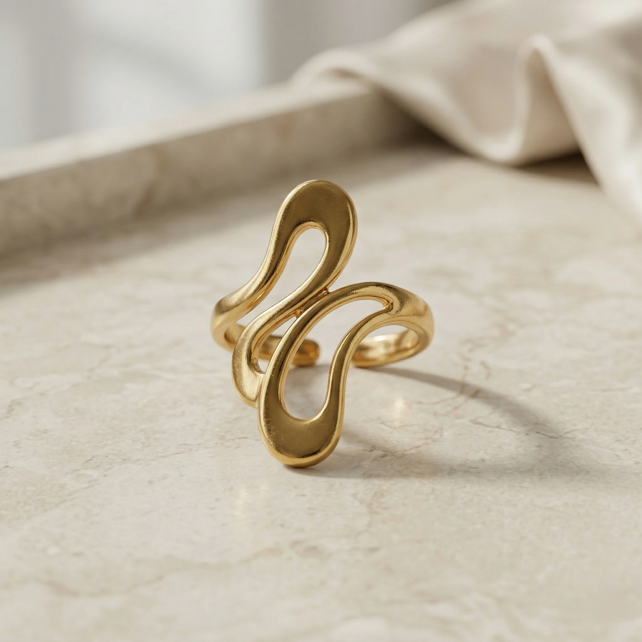 Sleek, modern, and effortlessly bold — the Golden Fluid Wave Ring is a true expression of contemporary elegance.